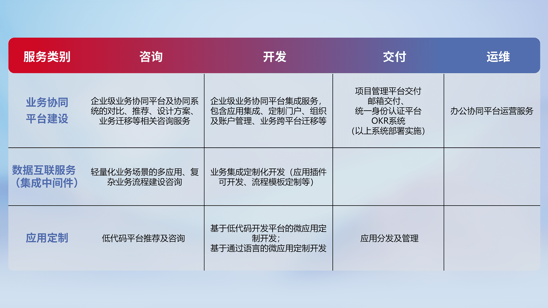 针对钉钉、、企微、、、IDaas等平台级产品提供产品的规划、、、、方案、、、交付、、、、定制化开发等服务,,实现如统一协同办公、、、智能客户服务、、混合会议管理、、、、智能数据查询、、、、等业务场景,,,,实现数字化转型。。